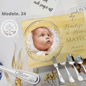 Caja Madera de Cubiertos Personalizada Bautizo con Bolsa de Tela Rafia