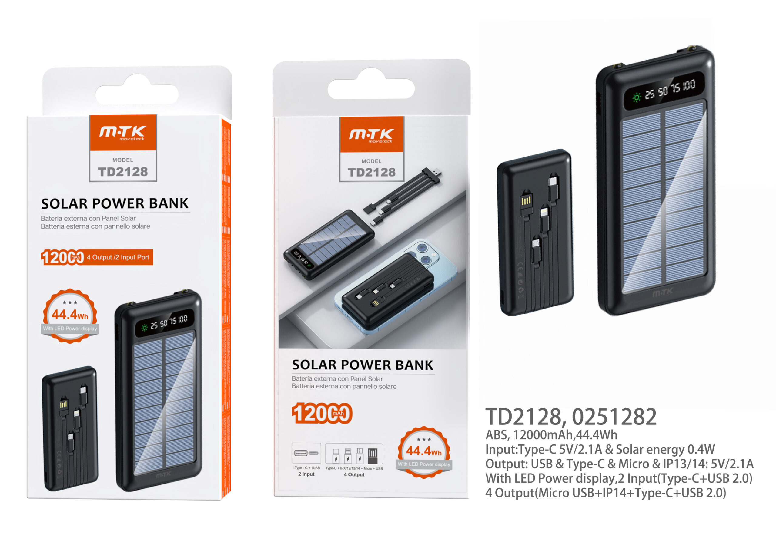 Bateria Externa 12000mAh TD2128 NE PowerBANK AYA con Panel Solar con luz de indicador 12000mAh/44.4Wh,2Entrada(Type-C+USB2.0), 4Salida con cable(Micro USB+Iphone+Type-C+USB2.0), Negro