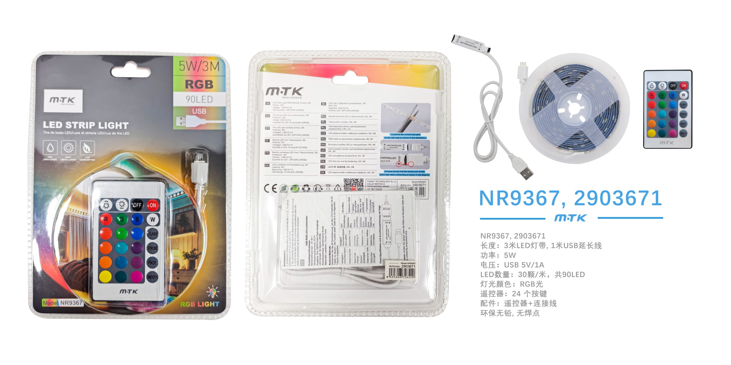 NR9367 BL Tira de Luces LED Regulable,Resistente al Agua (IP44),con control Remoto 24 Color,5V 1A,cable 3m,Blanco