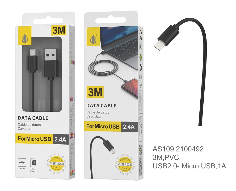 Cable de Datos Micro USB AS109-Cable de dato Para MicroUSB 2.4A, 3 Metros Negro