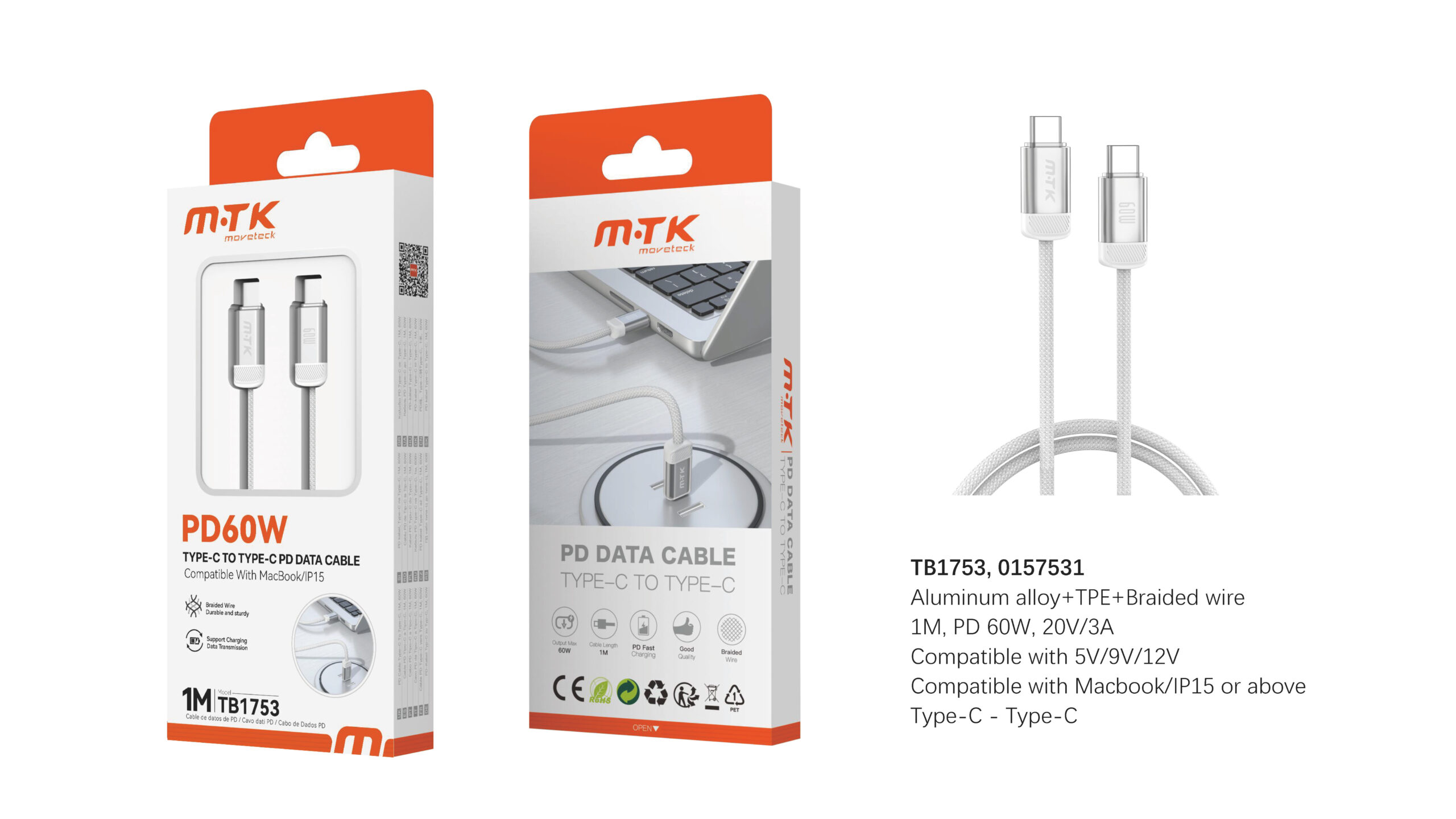 Cable Iphone Cable de Datos Tipe C a Type C TB1753 Luxury Cable de datos Dralvox trenzado para Type-C a Type-C , Compatible con Apple Type-C, 60W/20V/3A, 1M, Blanco+Plata