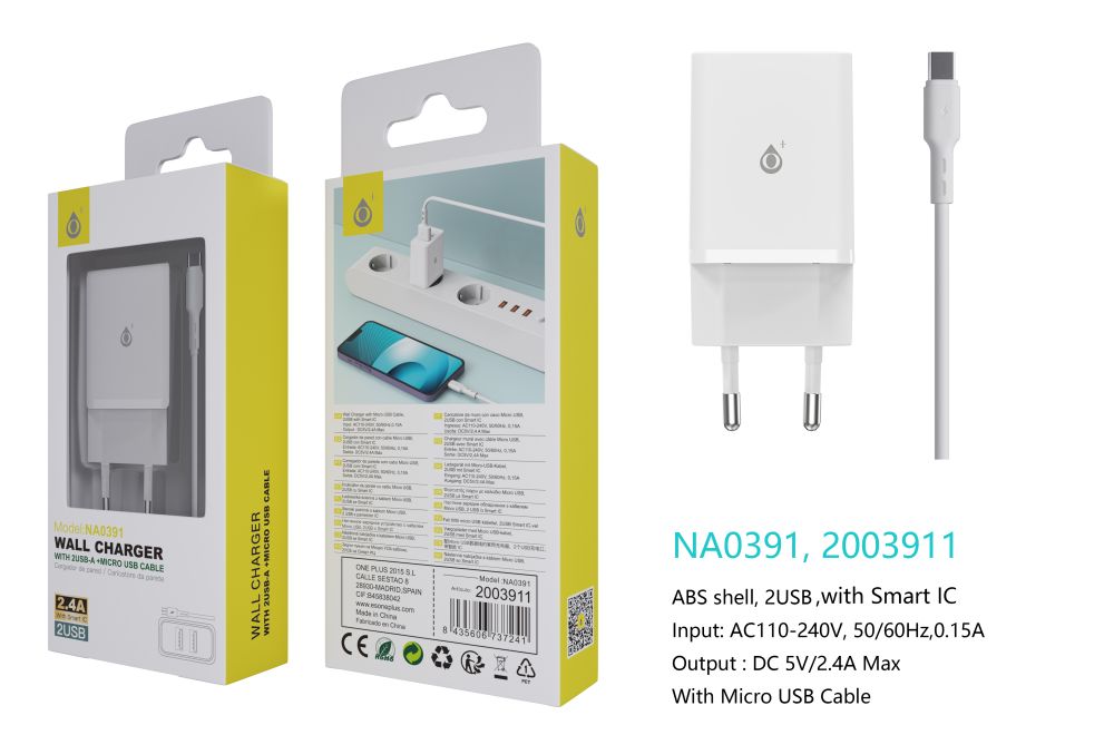 NA0391 BL Cargador de Red KAI 2 USB Con Smart Chip, Con Cable Micro USB, 2.4A, Blanco Cargador con Cable de Datos Micro USB – Energía segura y conexión confiable