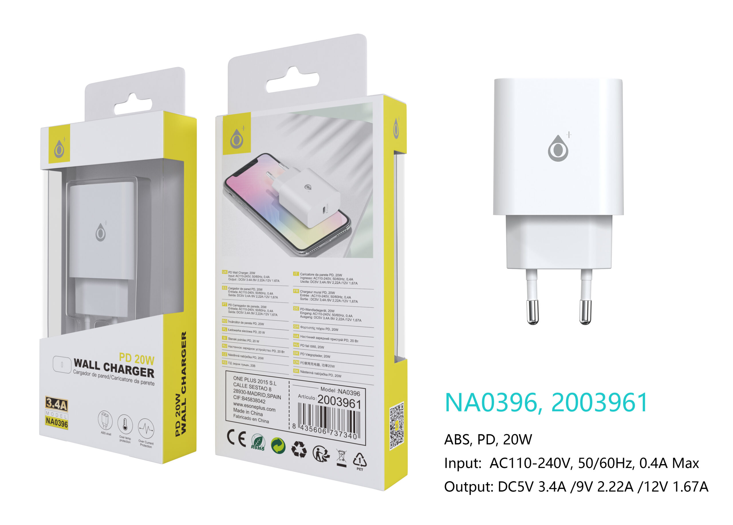 Cargador de Red NA0396 BL Cargador de Red Rapida Berta, 1 puerto USB-C PD, Sin Cable 20W/3.4A(Max), Blanco