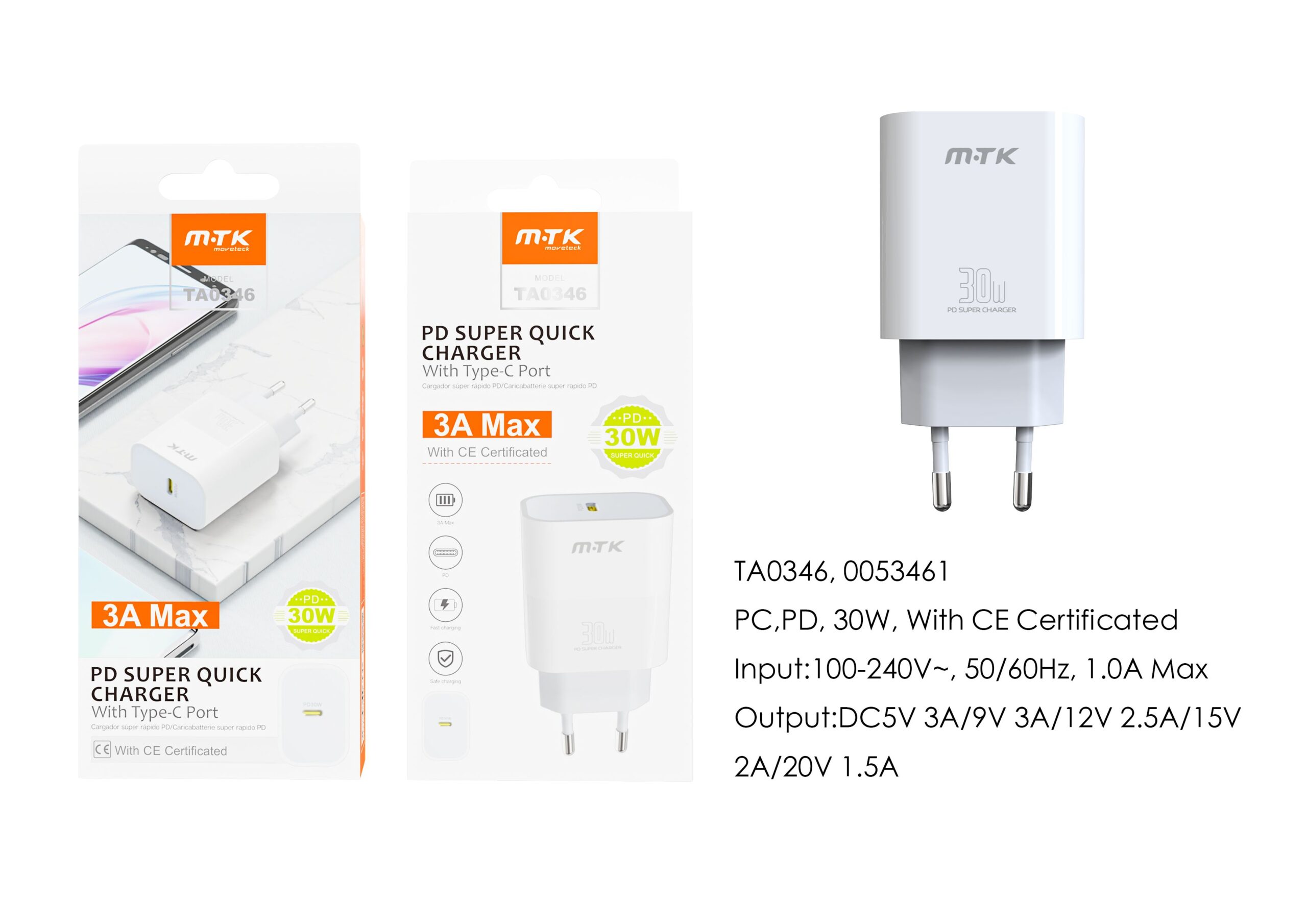 Cargador de Red TA0346 BL Cargador Rapido de Pared Marga Sin cable , Entrada Type-C(PD)/30W/3A Max , Blanco