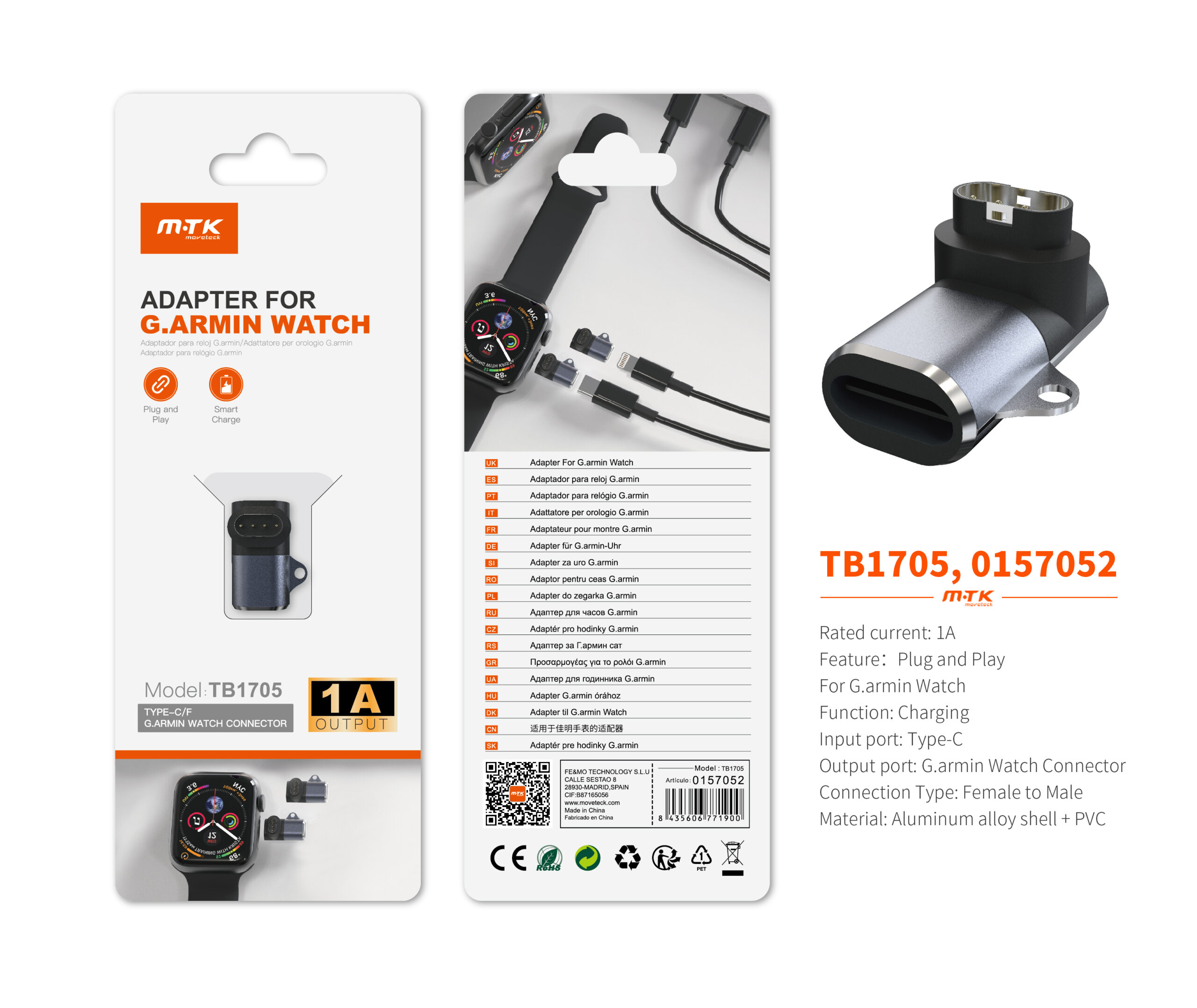 TB1705 GR Adaptador de carga USB-C para Reloj Garmin, 1A, GrisCargador para Reloj Smartwatch con Conexión Magnética