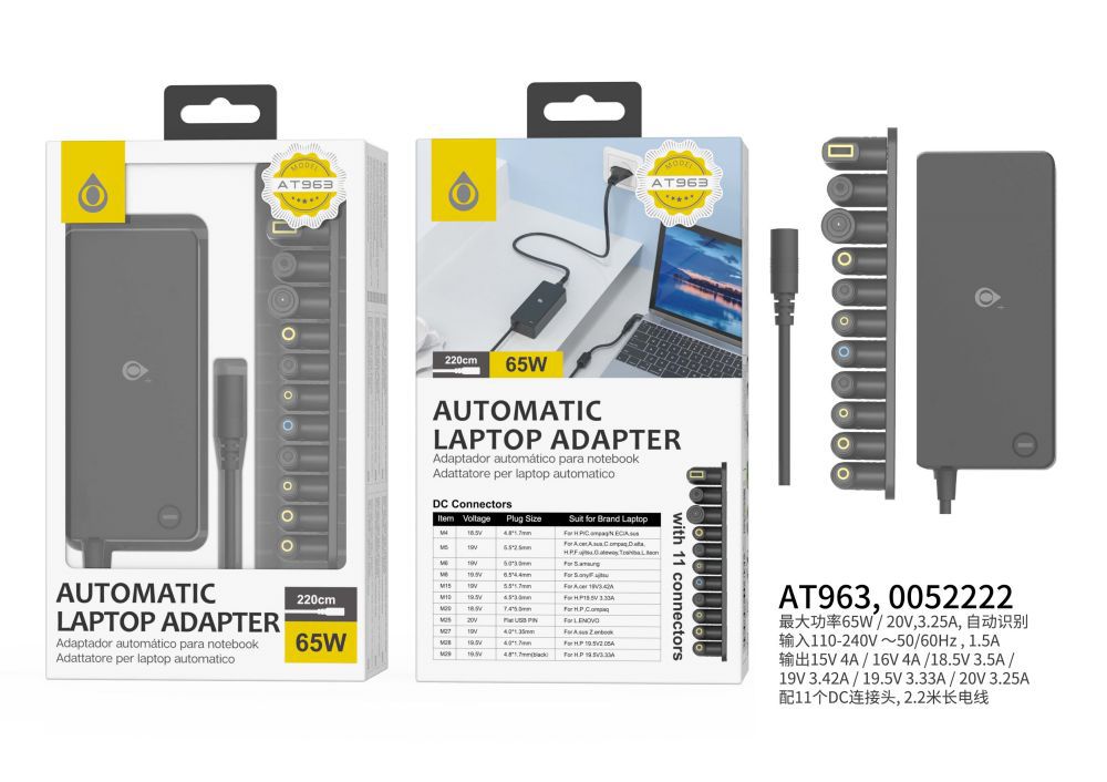 AT963 NE Cargador Universal Automatico con 11 Conectores para Portatiles , 65W, 3.25A Max, Cable 1.2M, Negro
