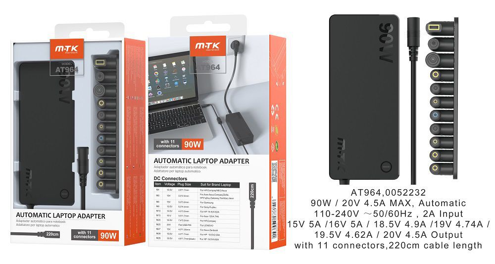 AT964 NE Cargador Universal Automatico con 11 Conectores para Portatiles , 90W, 5A Max, Cable 1.2M, Negro