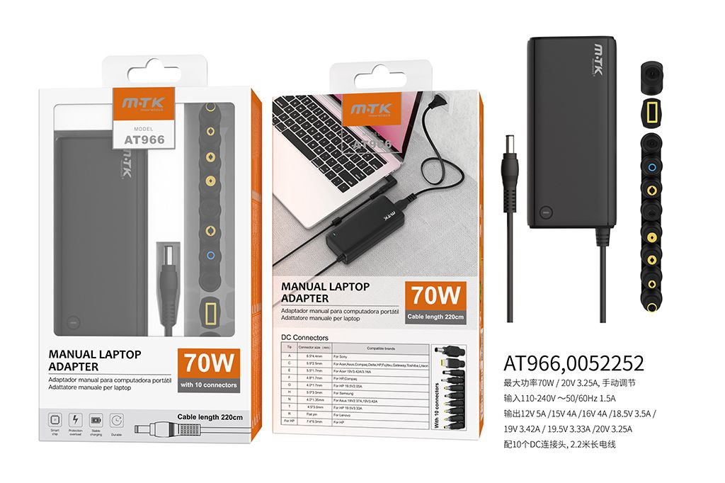 AT966 NE Cargador Universal Manual con 10 Conectores para Portatiles , 70W, 4A Max, Cable 1.2M, Negro