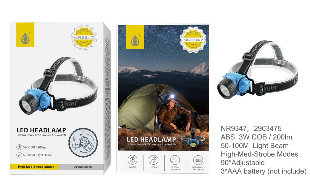 NR9347 AZ Linterna Frontal led 3W con 3 modos luz(Fuerte, Medio y Estroboscopica),Cabezal con giro ajustable 90°, Bateria 3*AAA (NO incluye) Azul