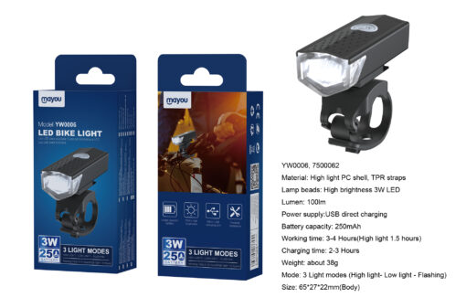 YW0006 NE Linterna con soporta para bicicletas, 3 modos (Fuerte/bajo/flash), Bateria recargable 250mAh/100lm,Negro
